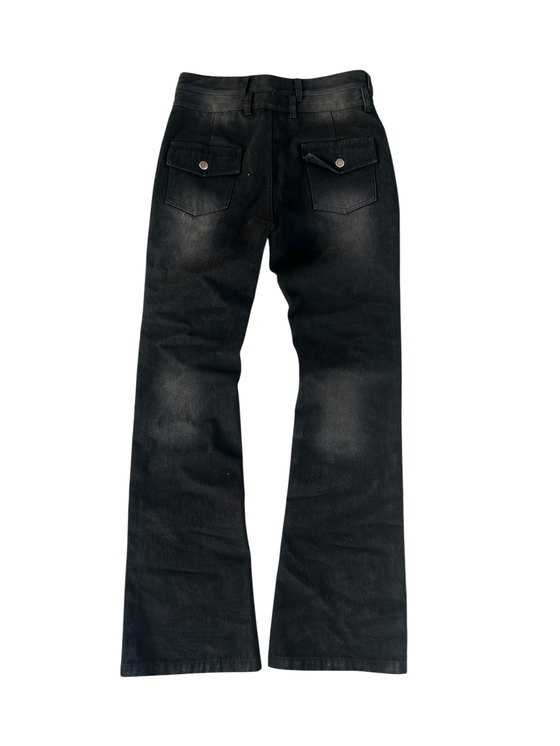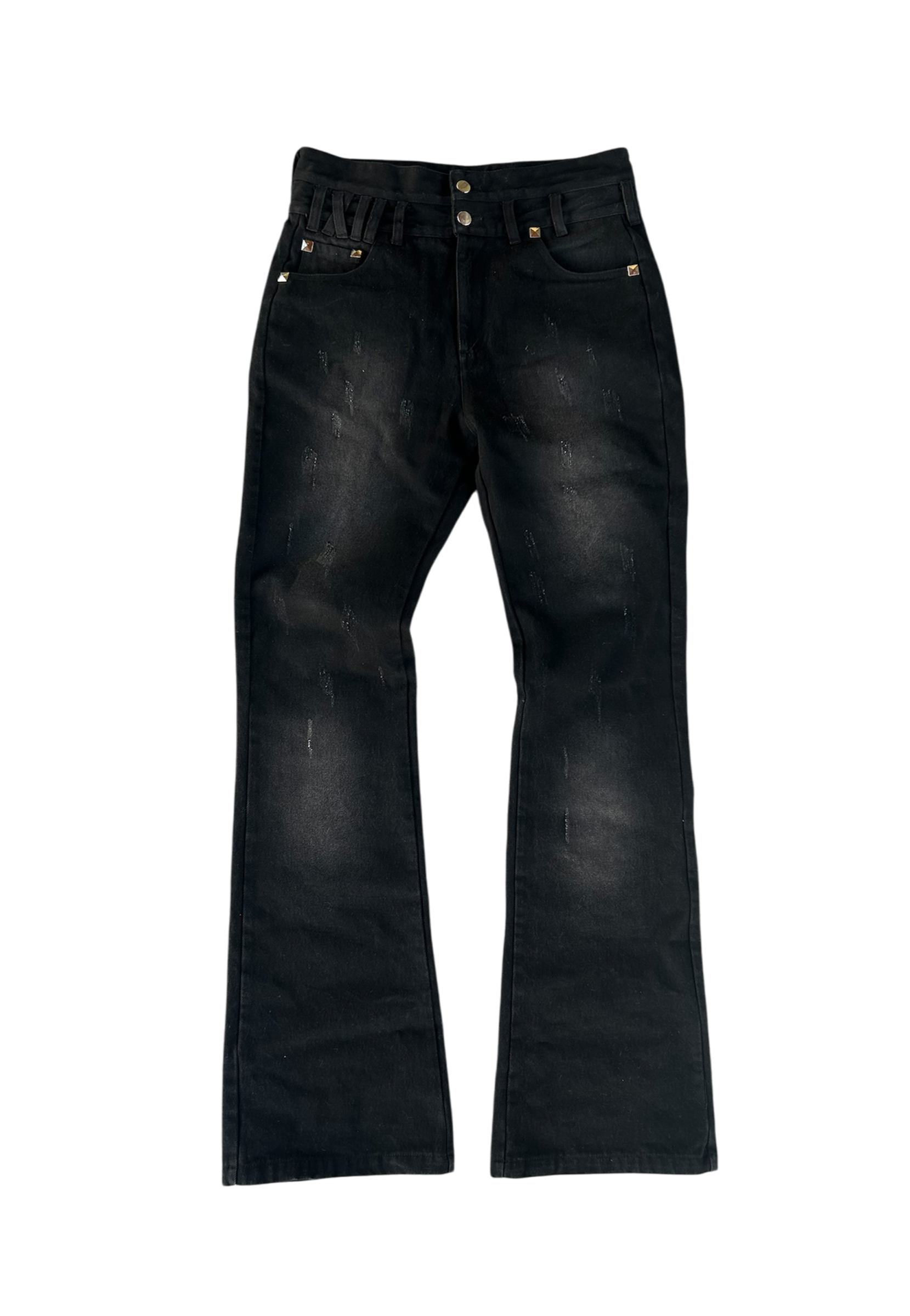 Features : Contains smooth heavy weight cotton with metal studs on pockets , Rip cuts on legs , Back pocket flaps